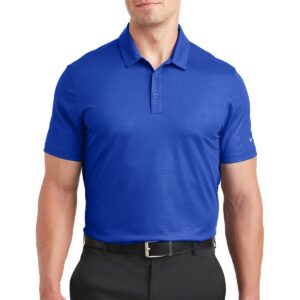 An allover embossed tonal tri-blade pattern gives this polo a sophisticated edge while Dri-FIT moisture management technology delivers breathable performance. Design features include a self-fabric collar, three-button placket and open hem sleeves. A contrast heat transfer Swoosh design trademark is on the left sleeve. Made of 5.29-ounce, 100% polyester Dri-FIT fabric.