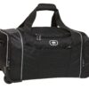Skate effortlessly through the airport with this wheeled duffel. Due to the size and/or weight of this product, it may require additional freight charges. See our Ordering Terms and Conditions for details. | 420D poly Locking retractable handle Large center storage Hidden exterior zippered pocket Side zippered pockets Wrapped handle Durable grip handle on foot, soft grip handles on top In-line skate wheels Dimensions: 22’h x 13’w x 12.5’d Capacity: 3,668 cu. in./60L Weight: 6.4 lbs./2.9kg Note: Bags not intended for use by children 12 and under. Includes a California Prop 65 and social responsibility hangtag.