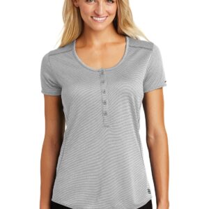 OGIO delivers an out-of-this world henley with micro textures and feminine styling. 4.4-ounce, 100% polyester heather double knit jacquard with stay-cool wicking technology OGIO heat transfer label for tag-free comfort Scoop neck Set-in, open hem sleeves Metal OGIO bar on left sleeve Coverstitching throughout 5-button placket with debossed O dyed-to-match buttons Rubber O heat transfer at hem Slight drop tail hem
