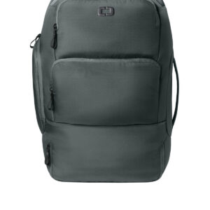 500D x 600D recycled RPET poly PU 200D recycled RPET poly debossed lining Top front organization pocket with radio frequency identification (RFID)-blocking technology lining Dedicated laptop compartment Hidden back passport pocket with RFID-blocking technology lining Spacious main compartment opening with interior zippered mesh pockets and divider Zippered front office pocket Zippered bottom front shoe pocket Zippered side storage pocket Padded top, side and bottom haul handles Padded shoulder straps Luggage trolley pass through panel on back Metal O icon logo on front Laptop sleeve dimensions: 18’h x 13.5’w; fits most 18′ laptops Dimensions: 21.7’h x 13.8’w x 8.3’d Capacity: 2,379 cu. in./39 L Weight: 2.73 lbs./1.3 kg Note: Bags not intended for use by children 12 and under.