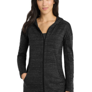 This easy-to-layer piece has a clean, modern OGIO look with jacquard side panels for modern style. 9.7-ounce, 96/4 poly/cotton knit shell 9.7-ounce, 96/4 poly/cotton jacquard knit insets Locking reverse coil zipper 3-panel hood Drop shoulder Open pockets Longer length Curved front hem Split back, drop tail hem Black reflective O heat transfer on front left hem