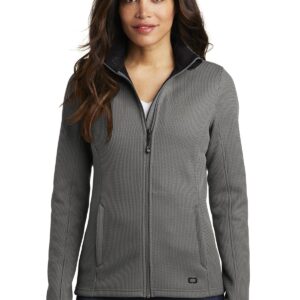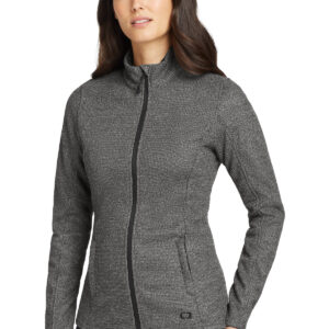 With a unique and rugged texture, this jacket shows real grit. Heavy gauge knit, an embossed lining and understated details give it a sharp take on utility and comfort. 12.4-ounce, 100% poly knit bonded to 100% poly brushed-back fleece Zip-through cadet collar OGIO heat transfer label for tag-free comfort OGIO locker loop Embossed lining with subtle O pattern Reverse coil zipper with OGIO zipper pull Embroidered O on front and back Front zippered pockets Open cuffs and hem