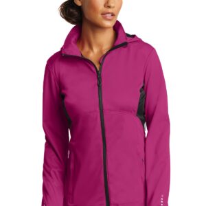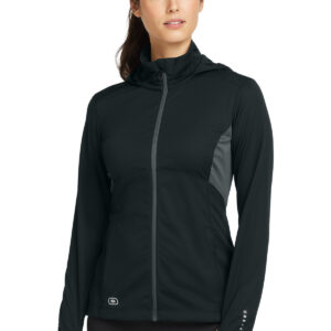 WATER-RESISTANT HOOD PIVOTS FOR CLEARER PERIPHERAL VISION REFLECTIVE DETAILS | 100% poly interlock bonded to poly interlock with a laminated film insert for water resistance 5,000MM fabric waterproof rating 5,000G/M2 fabric breathability rating Articulated shaping for ease of movement Reflective OGIO heat transfer label for tag-free comfort Reflective O heat transfer at hood Zip-through cowl collar Reflective zippered back stash pocket Lower front zippered pockets Set-in sleeves with shaped cuffs and thumbholes for warmth Reflective stacked O heat transfers at sleeves Slight drop tail hem with reflective O heat transfer at back left hem