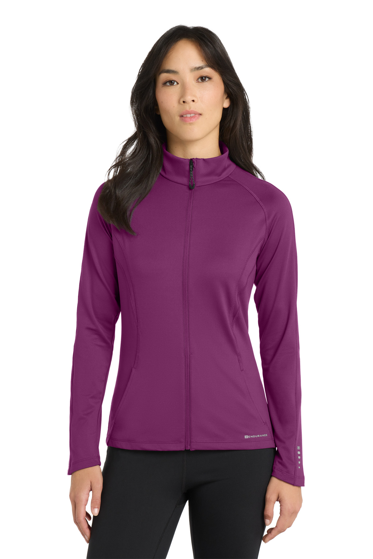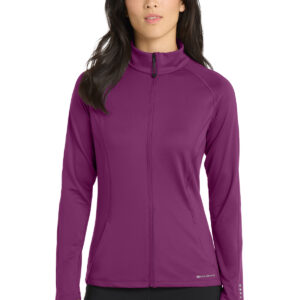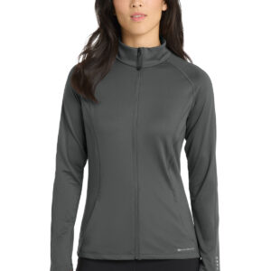STAY-COOL WICKING LAYERABLE WARMTH STRETCH FLATLOCK SEAMS FOR COMFORT REFLECTIVE DETAILS 6.7-ounce, 91/9 poly/spandex jersey with stay-cool wicking technology Lightly brushed interior Reflective OGIO heat transfer label for tag-free comfort Zip-through cadet collar with molded cord pull Reflective O heat transfer at center back Raglan sleeves with shaped cuffs Reflective stacked O heat transfers on sleeves Front pockets Drop tail hem Reflective O heat transfer at front left hem
