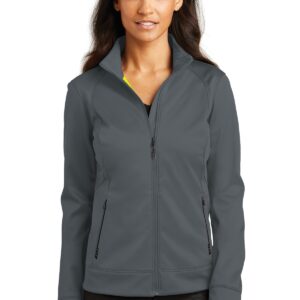 This water-resistant jacket has an on-trend fit and an ultra cool vibe thanks to its flattering length, curved drop tail hem, princess seams and welding details.| 8-ounce, 100% poly interlock bonded to 6.5-ounce, 100% poly microfleece 5000MM fabric waterproof rating 5000G/M 2 fabric breathability rating Contrast color inner fleece Zip-through cadet collar O heat transfer at center back Front and back princess seams Reverse coil zipper with rubber OGIO zipper pull Front zippered pockets with welding details and matte black O zipper pulls Open cuffs OGIO woven badge on left side seam Curved drop tail hem