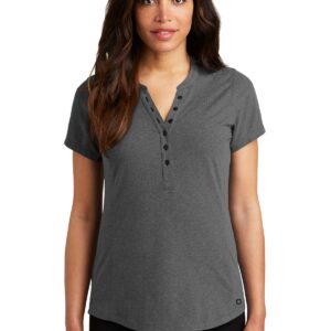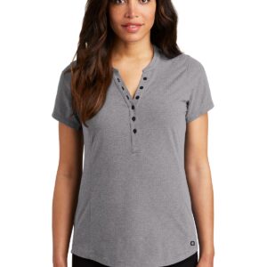 Designed for dynamic impact, this henley looks and feels like cotton, but still performs with stretch. 4.6-ounce, 73/21/6 cotton/poly/spandex jacquard jersey with stay-cool wicking technology OGIO heat transfer label for tag-free comfort 6-button placket with flat metal buttons Front princess seams Pleat at back yoke Contrast coverstitching on back yoke and at buttonholes Set-in, open hem sleeves Rubber heat transfer O at left hem