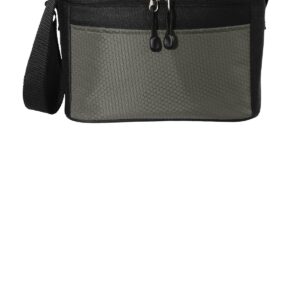 This cooler easily holds six cans as well as an ice pack and other must-haves. 420 denier honeycomb polyester, 600 denier polyester canvas Adjustable web carrying strap Heat-sealed, water-resistant lining Interior zippered mesh pocket for utensils Large front slip pocket for easy decoration access Dimensions: 6.25’h x 9’w x 7’d; Approx. 393 cubic inches Note: Bags not intended for use by children 12 and under. Includes a California Prop 65 and social responsibility hangtag.