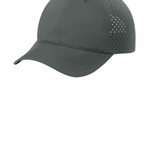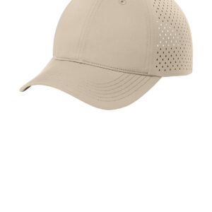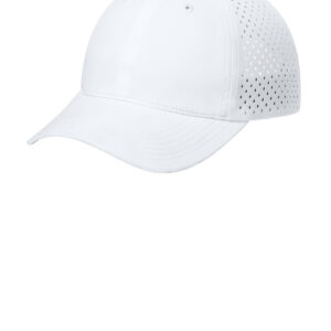 100% polyester Moisture-wicking UPF rating of 50 (front panels and bill only) Stretch sweatband Laser cut teardrop-shaped perforation Unstructured Low-profile Curved bill Elastic and D-ring with silicone tab Low-profile hook and loop closure **
