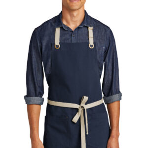 8.5-ounce, 100% cotton canvas Contrast 100% cotton webbing neck and waist ties Antique brass metal grommets and neck adjuster Two patch pockets with antique brass metal rivets 21.25’w x 30.25’l