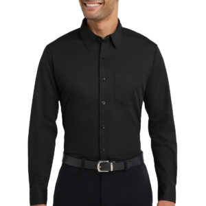 Designed for modern office pros and urban commuters, our sleek dress shirt fuses the comfort of a knit with the structure of a woven shirt. It wicks moisture, has ease of movement and an unencumbered fit. | 3.8-ounce, 100% micropique polyester tricot Versatile collar that can be worn open or buttoned down Dyed-to-match buttons Left chest pocket Rounded adjustable cuffs