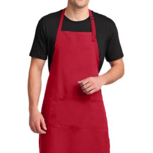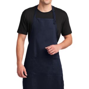 This extra-long apron offers protection from stains and wrinkles. The adjustable neck strap ensures a proper fit. | 8-ounce, 65/35 poly/cotton twill Three front pockets 25’w x 34.5’l