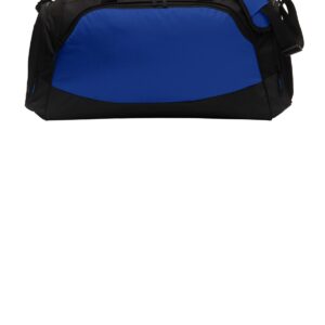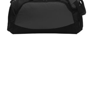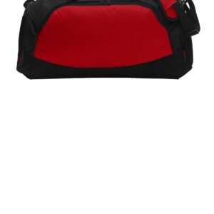 Sized to fit the gear you need to be active, this duffel also has several pockets to keep things organized. A lined, padded bottom gives this durable bag structure and protection.| 600 denier polyester canvas, contrast ripstop accents, abrasion and water-resistant coated bottom Large decoration-friendly front zippered pocket Zippered end pocket with exterior stretch mesh pocket Zippered end pocket with gusseted shoe, ball or equipment pocket with mesh for ventilation Webbing zipper pulls with contrast stitching Padded handle Adjustable, removable shoulder strap with no-slip pad Dimensions: 12’h x 26’w x 12’d; Approx. 3,745 cubic inches Note: Bags not intended for use by children 12 and under. Includes a California Prop 65 and social responsibility hangtag.