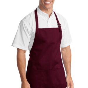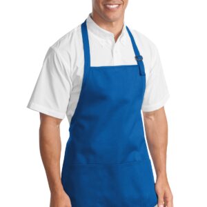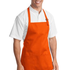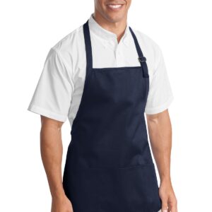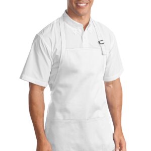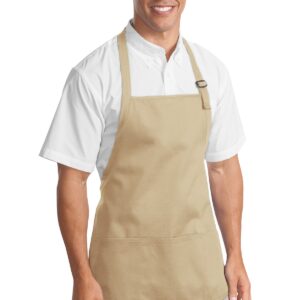 This versatile apron offers stain-release protection. | 7-ounce, 100% cotton twill with stain-release protection Three pouch pockets, pen pocket 1-inch wide neck and waist ties, adjustable neck strap Measures 22’w x 24’l