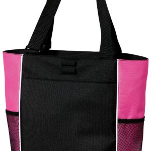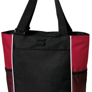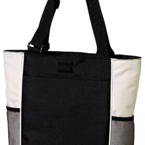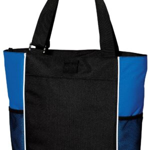 This tote has a secure zippered top and adjustable webbing handles for easy carrying. | 600 denier polyester canvas Zippered opening Large front pocket for easy decoration Adjustable web handles Pen holder loops Two side mesh pockets Dimensions: 14.875′ h x 13.25′ w x 5.125′ d; Approx. 1,010 cubic inches Note: Bags not intended for use by children 12 and under. Includes a California Prop 65 and social responsibility hangtag.
