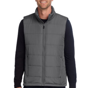 With wider baffles for a modern look, this water-resistant puffer looks cool while keeping you warm. 100% polyester shell and lining Molded center front zipper Interior storm flap Zippered hand pockets Insulation method: 4.4-oz. polyfill Water protection method: water-repellent finish Port Pocket ™ for decoration access