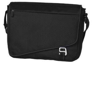 Constructed from durable ballistic fabric, this modest, modern messenger will keep basics organized while protecting your tablet and laptop with padded compartments. | 1,680 denier ballistic polyester Large main compartment with padded tablet sleeve Zippered pocket on front flap for easy embellishment Organization panel under asymmetrical front flap Adjustable sling shoulder strap Laptop sleeve dimensions: 11’h x 14.5’w x 1’d; fits most 15′ laptops Dimensions: 11’h x 15’w x 3.25’d; Approx. 536 cubic inches Note: Bags not intended for use by children 12 and under. Includes a California Prop 65 and social responsibility hangtag.