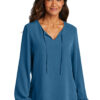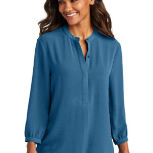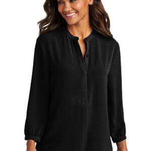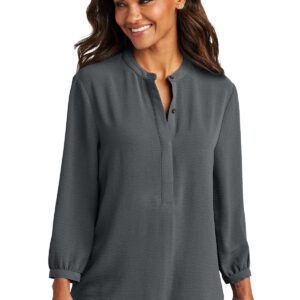 This beautifully draped tunic makes a statement with its longer length and accentuated gathers at the back yoke. 4.5-ounce, 100% polyester textured crepe Banded collar Covered placket Dyed-to-match faux shell buttons Deep Black buttons (Graphite) 3/4 sleeves with single-button cuffs Back yoke gathers Rounded drop tail hem
