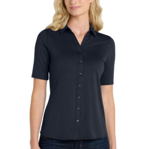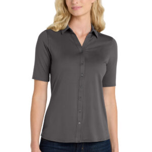 Performance joins professionalism in this Easy Care style that is snag-resistant and wicks moisture while also resisting odors. 5.6-ounce, 94/6 poly/spandex Snag-resistant Stretch Moisture-wicking Odor-resistant Easy Care Y-neck collar Tag-free label Full-button placket Pearlized smoke buttons Longer length short sleeves Slightly curved hem Drop tail hem