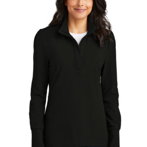 Designed for the fairway or the corporate hallway, this cotton-rich 1/4-zip adds a lightweight layer of warmth with enough stretch for easy movement. 6.1-ounce, 70/26/4 cotton/poly/spandex jersey Cadet collar Covered zipper placket Pleats at shoulders and cuffs Inverted box pleat at back yoke Wide rib knit cuffs Rounded, high-low hem Tag-free label
