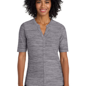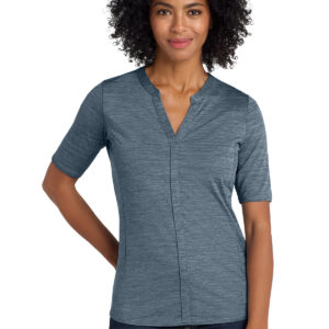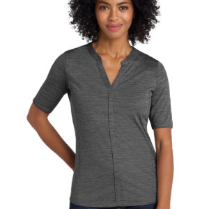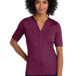 With an elevated heather look, this office-ready top has plenty of stretch for unrestricted movement. With moisture wicking, this style also performs. 5.2-ounce, 93/7 poly/spandex drop needle jersey Tag-free label Open neckline Center front placket detail Front seaming Open hem sleeves Slightly longer sleeves Slightly curved hem