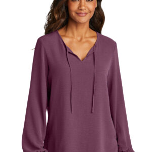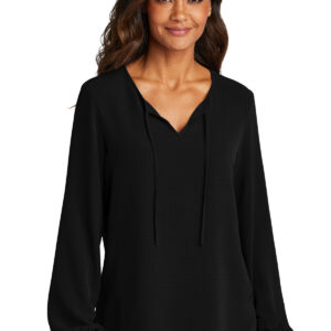 A fresh neckline with tie gives this comfortably flowy blouse a sophisticated look. 4.5-ounce, 100% polyester textured crepe Open neck with self-fabric tie Elastic cuffs Side slits