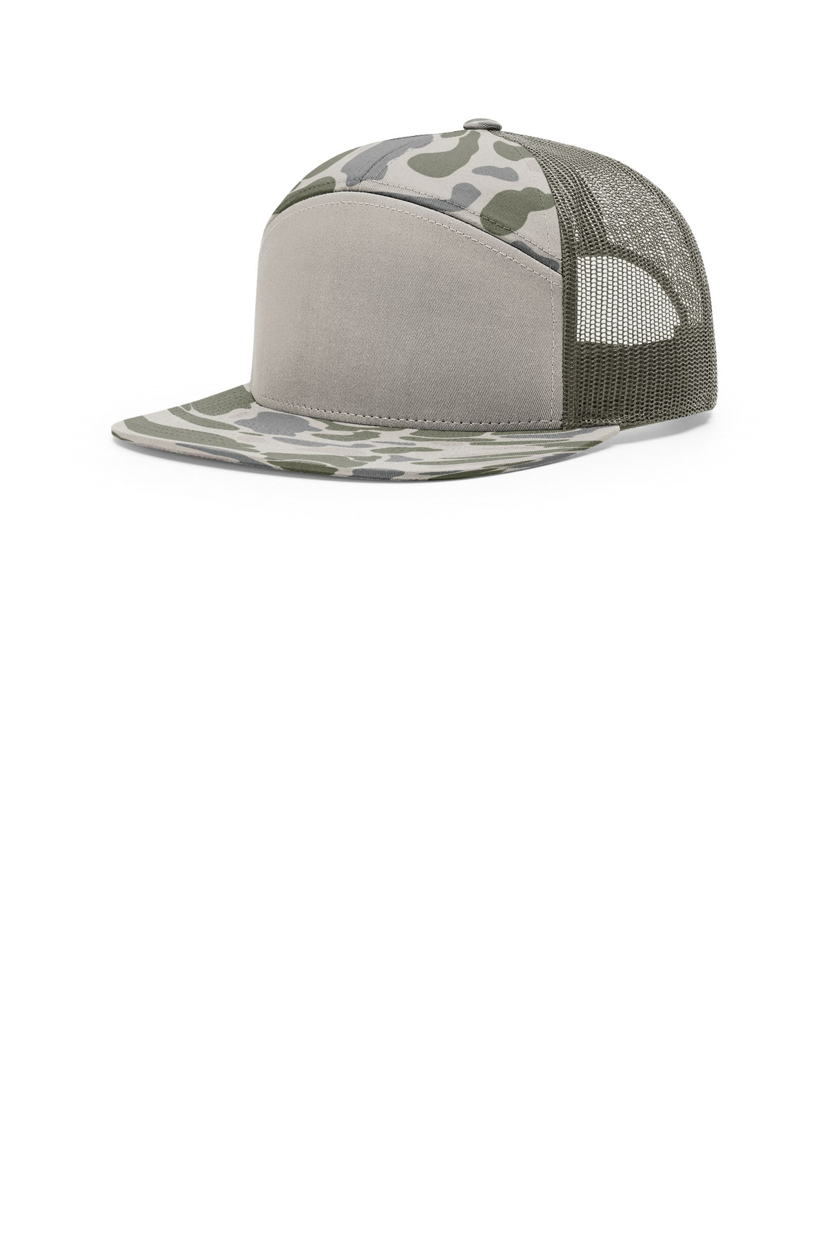 A contemporary seven-panel trucker with a flat bill and Hi Pro shape, this version offers both camo and Richardson’s duck camo prints. 100% polyester front and 100% polyester mesh back 7 panels Structured High Pro shape Flat bill Adjustable snapback closure Cotton sweatband **