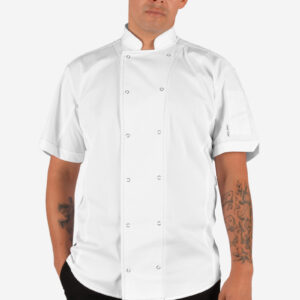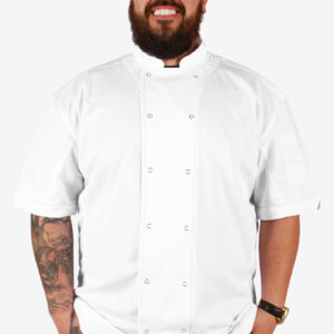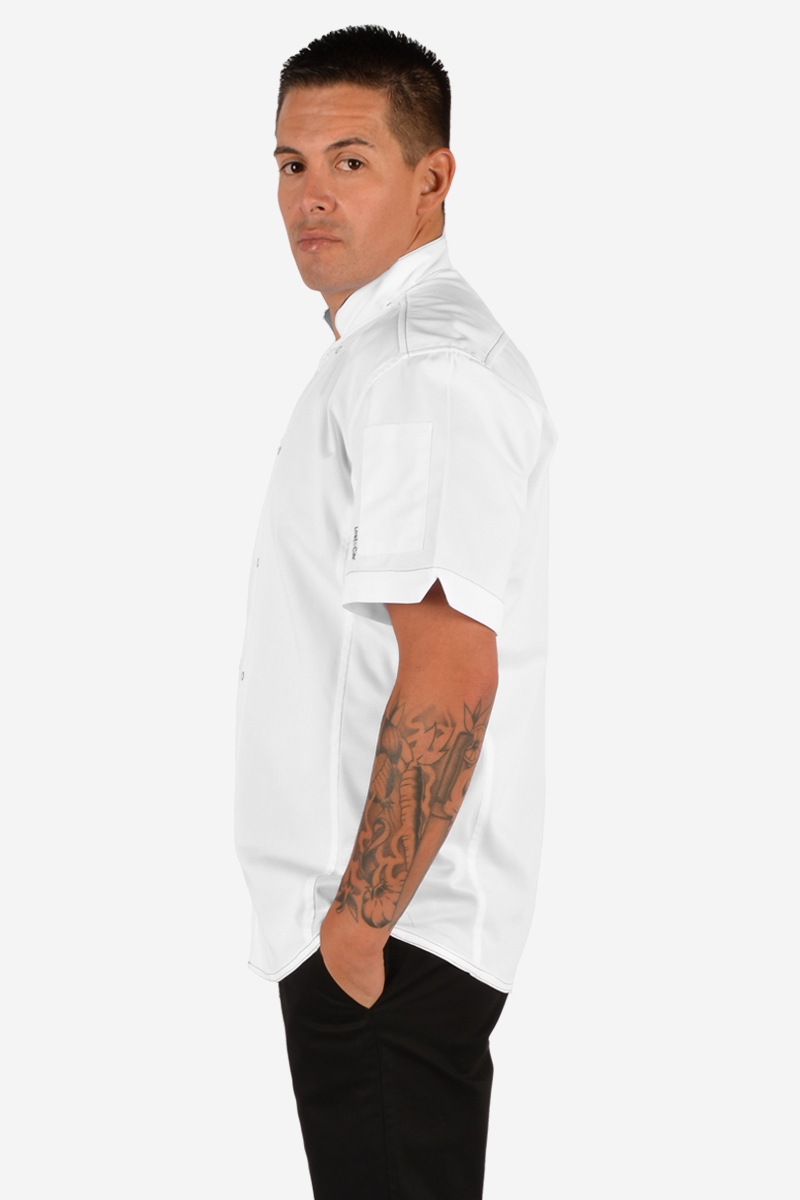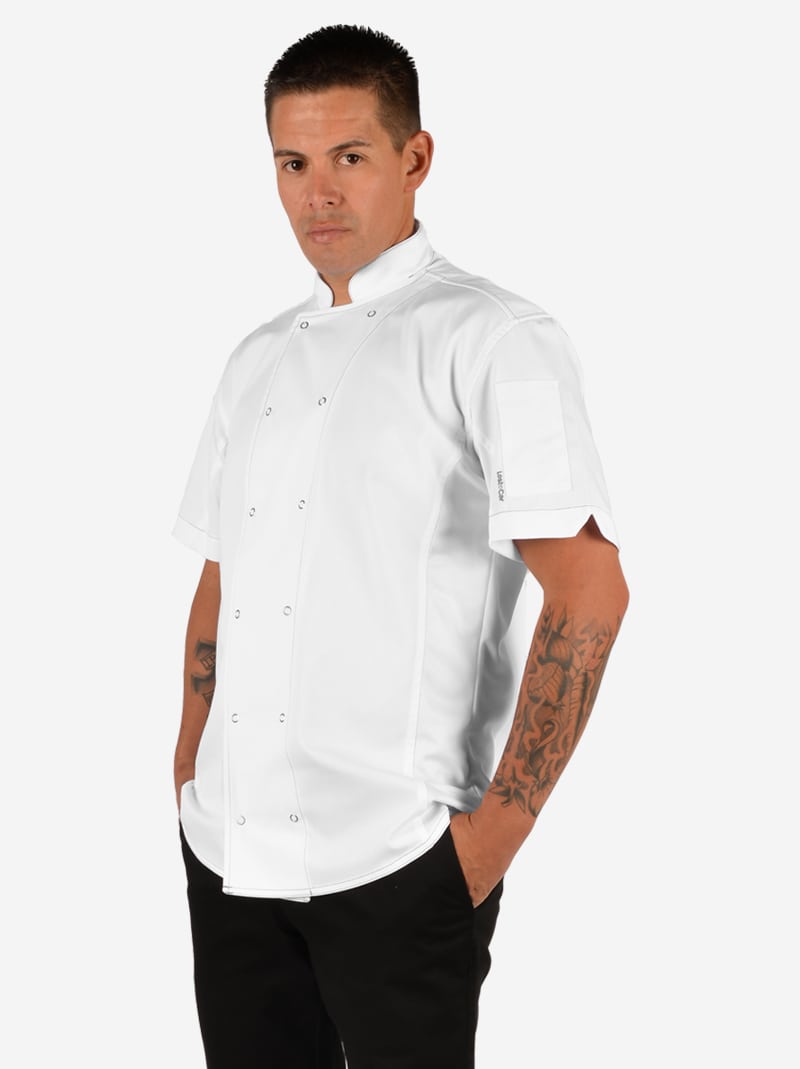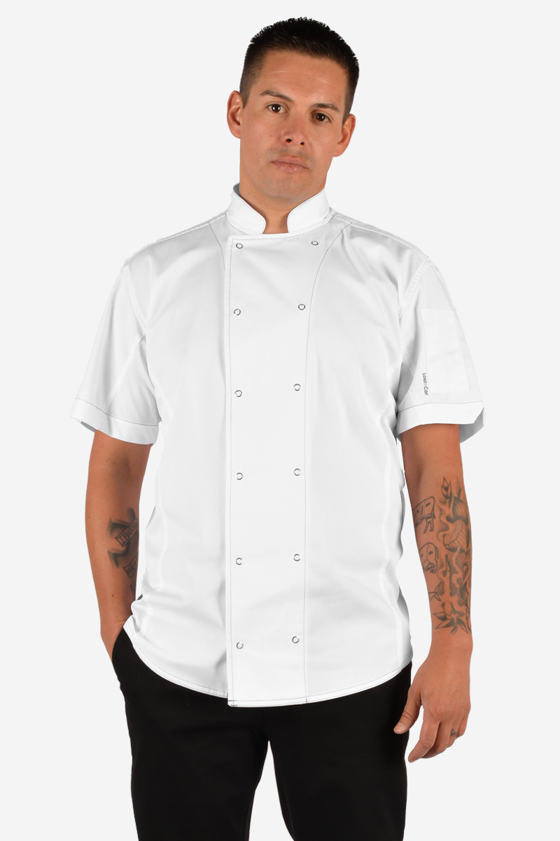 • Chef (1) is wearing a size L and is 6’2″, approx. 205 lbs.