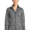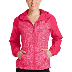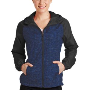 A heather print gives this water-resistant wind jacket a sporty, energized look.| 100% polyester shell 100% polyester mesh body and hood lining 100% polyester woven sleeve lining Tag-free label Three-panel hood with drawcord and toggles Angled chin guard for additional comfort Exposed molded zipper Princess seams with integrated front slash pockets Half elastic, half self-fabric cuffs for comfort Decoration access pocket Slight drop tail hem Drawcord hem with toggles