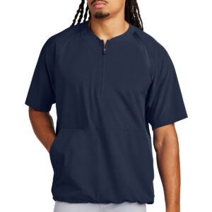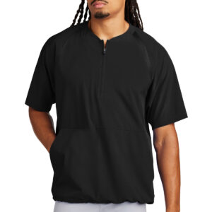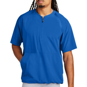 Knock it out of the park with this extra roomy, moisture-wicking short sleeve jacket. 3.5-ounce, 90/10 poly/spandex 100% poly tricot mesh insert Snag-resistant Tag-free label Contrast tonal mesh panels at shoulder Front pouch pockets Adjustable fit at hem with side toggles