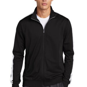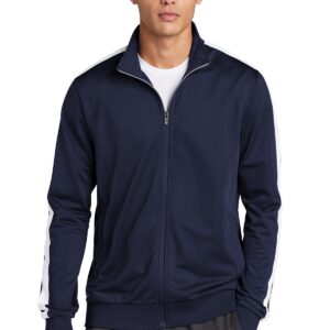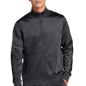 The classic tricot track jacket with pieced stripes and rib knit details. 100% polyester tricot 100% polyester rib knit cuffs and hem Soft-brushed backing Cadet collar Tag-free label Reverse coil zipper Pieced stripe on shoulders and sleeves Front pockets