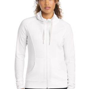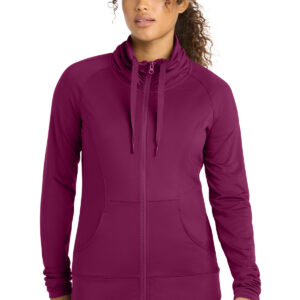 A stretchy, moisture-wicking performance jacket with a soft-brushed backing and unique cowl collar. | 6.8-ounce, 90/10 poly/spandex jersey Tag-free label Zip-through cowl collar with ruching Dyed-to-match drawcord Dyed-to-match Sport-Tek ® logo neck taping Reverse coil zipper Raglan sleeves Front pouch pockets Ruching at cuffs Self-fabric hem